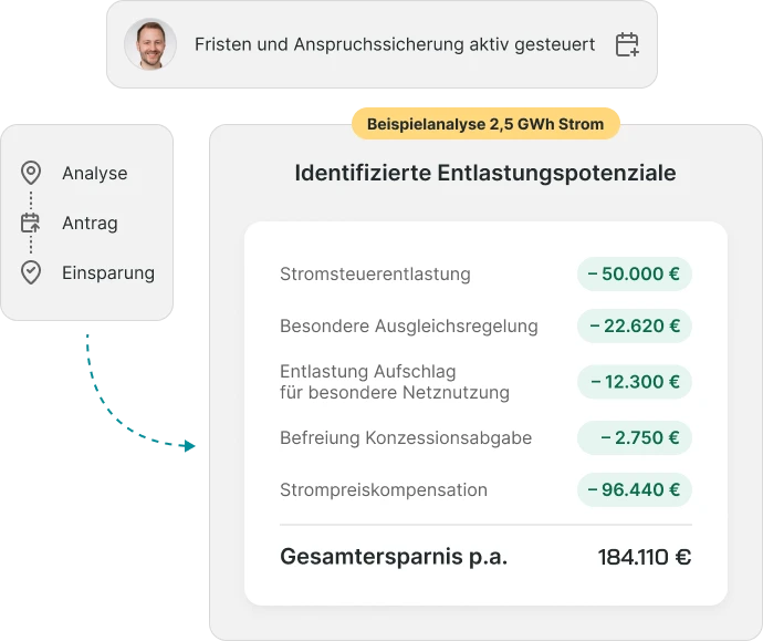Viele Unternehmen nutzen bestehende Entlastungsmöglichkeiten wie Stromsteuererstattungen oder Umlagenentlastungen nicht vollständig aus. Wir prüfen systematisch, welche Potenziale im individuellen Fall bestehen, bewerten die relevanten Voraussetzungen und unterstützen bei der strukturierten Umsetzung.