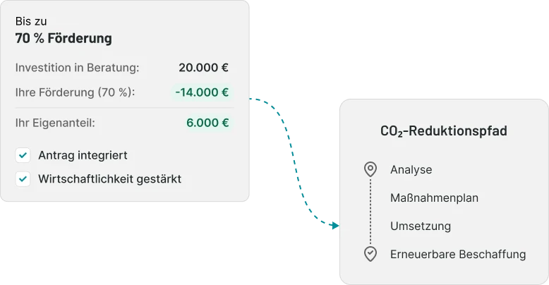 Viele Effizienz- und Transformationsmaßnahmen lassen sich durch Förderprogramme wirtschaftlich deutlich attraktiver gestalten. Wir identifizieren passende Programme, begleiten Unternehmen bei der Antragstellung und unterstützen bei der Umsetzung der Projekte.